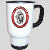 White 14oz Stainless Steel Travel Mug. Not dishwasher safe. Resilient plastic lid, handle, and base